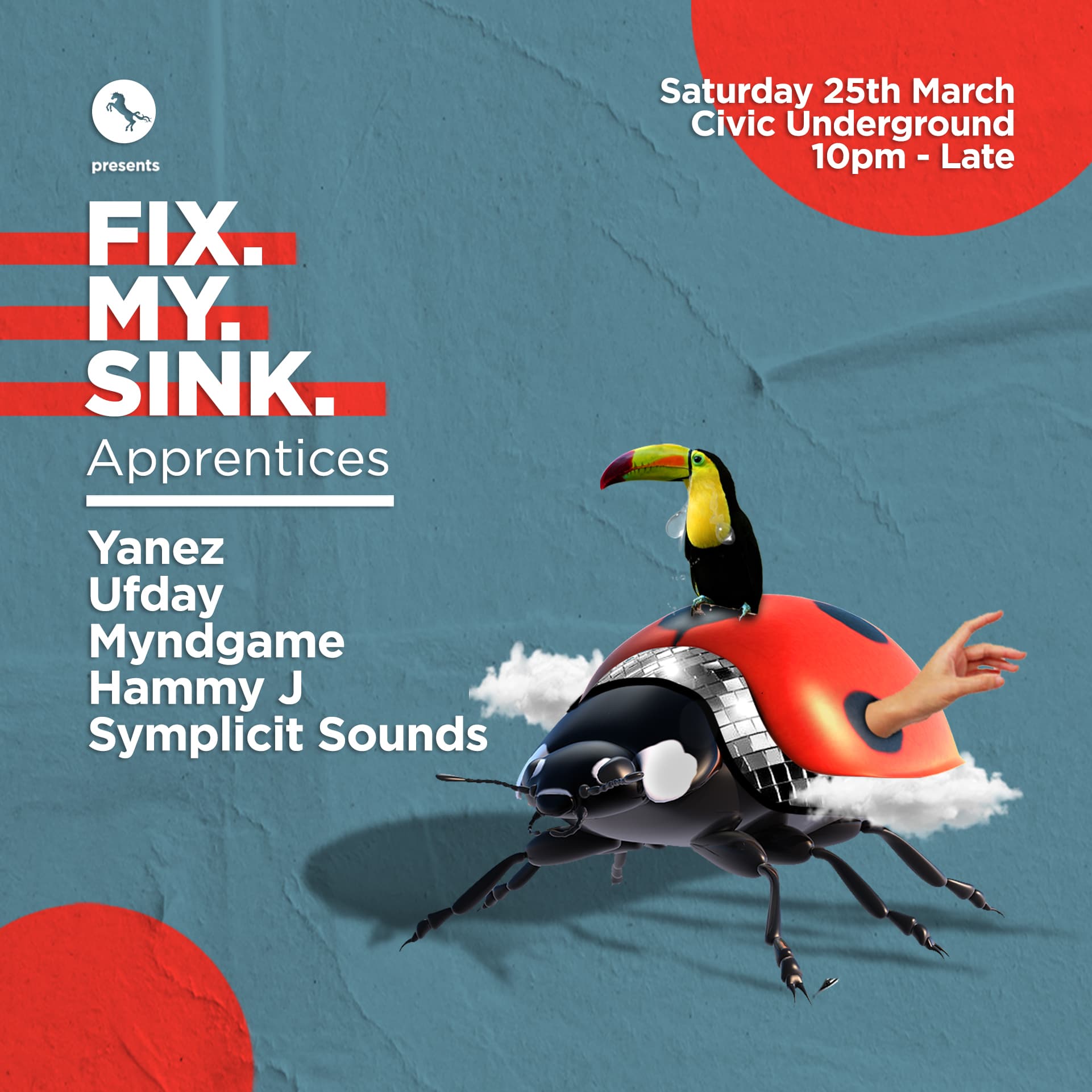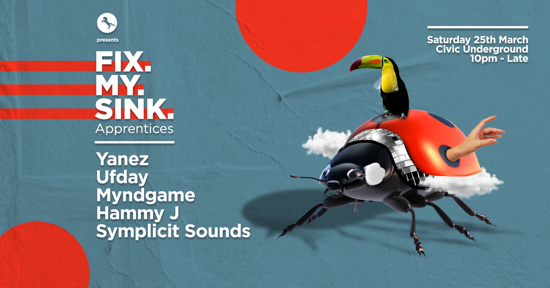 First into the underground plumber’s playground, Symplicit Sounds bring their sound. Looking after the next sink, trying not to pull his hamstring in doing so, Hammy J joins the apprentices. Following foreman orders will be Yanez. Myndgame begins his confusion shortly after and Ufday will be doing all of the final checks on the dancefloor to bring our messy, muggy and moistened Civic to a close. All of these young plumbers continue to impress us with their deep and dubby house melodies so we’ve entrusted them to repair the Civic woes.