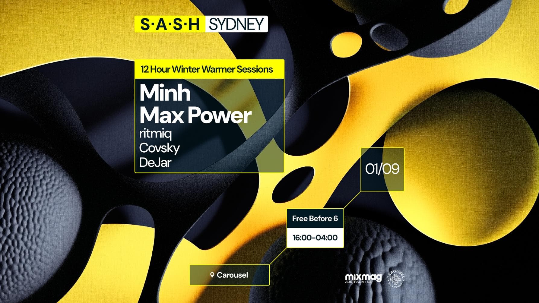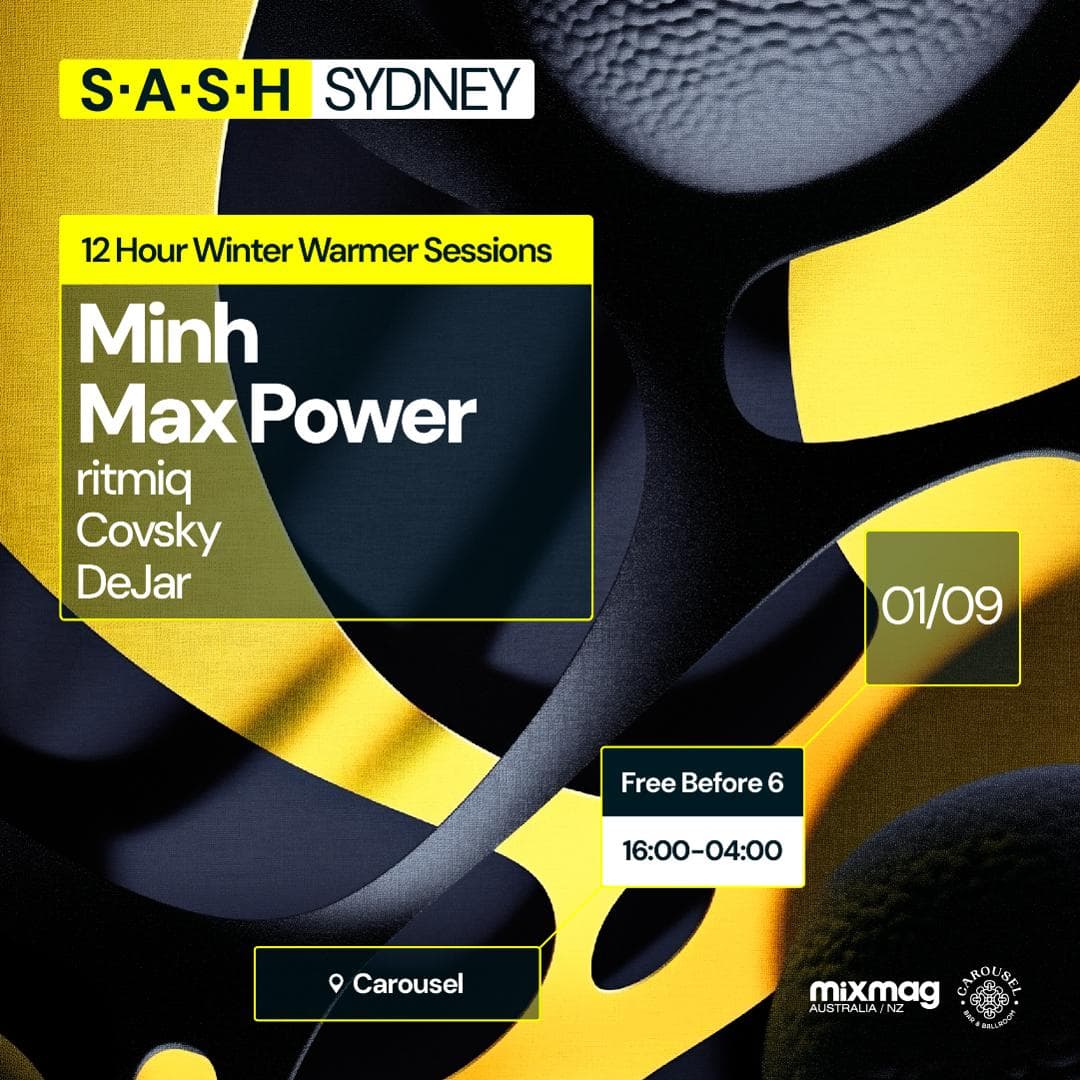 Max Power brings his emphatic nature to the club, taking control of Carousel in the early hours of the evening. With a history of big tunes, Max most certainly has the power to turn things up a notch. Later in the evening we receive a dirty showcase from bad man Minh. His dark tunes are sure to kick up a storm and keep the dance floor entertained. Ritmiq step’s back up into the booth to close out the night, he's got the tunes, the style, and the skill to tie it all together. Covsky returns to the saddle after realising his love for proper house, and dynamic duo DeJar from down south receive a warm welcome as S.A.S.H padawans to begin the marathon.